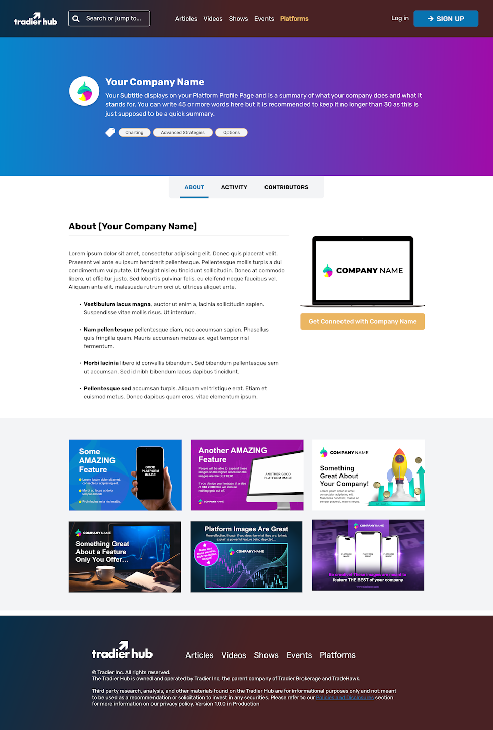 Once you have requested to become a Tradier Hub Contributor, a member of our Hub team will guide you through the easy steps of setting up your profile. Once that is complete, you will have access to edit your Platform Profile Page.